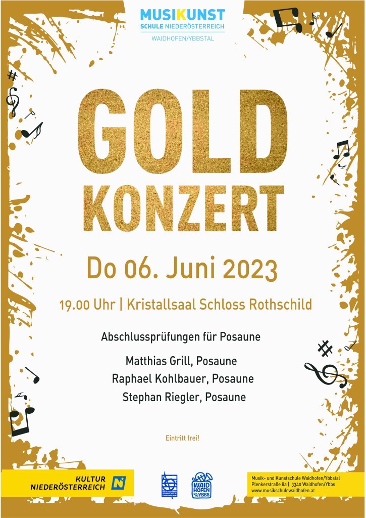 Am 6. Juni 2023 treten wieder Musikschüler der Musik- und Kunstschule Waidhofen/Ybbstal zu ihrer letzte Übertrittsprüfung in Gold an. Raphael Kohlbauer, Matthias Grill und Stephan Riegler werden beim Goldkonzert im Kristallsaal vor einer fachkundigen Jury und dem Konzertpublikum ihre musikalischen Fähigkeiten auf der Posaune unter Beweis stellen. Die Musik- und Kunstschule Waidhofen/Ybbstal ist stolz auf den Erfolg und freut sich über das bevorstehende Konzert der Musikschüler, die es durch viel Fleiß bis zur Goldprüfung geschafft haben. Musikbegeisterte und Kulturinteressierte dürfen gerne bei freiem Eintritt diesem musikalischen Ereignis beiwohnen!