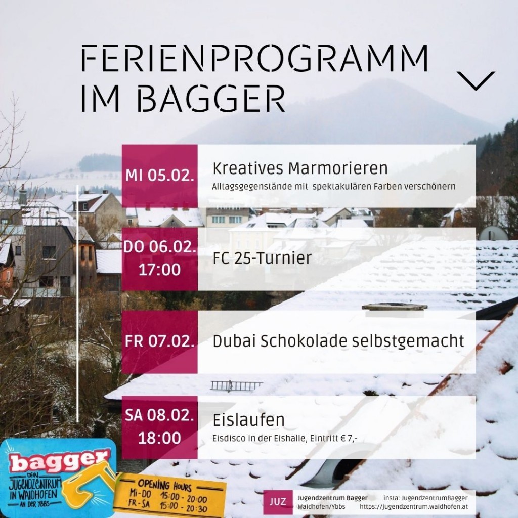 Das Jugendzentrum Bagger ist in den Semesterferien mit einem abwechslungsreichen Programm zu den gewohnten Öffnungszeiten für Jugendliche in Waidhofen da. Zum Auftakt am Mittwoch 5.2. gibt es die Möglichkeit kreativ zu werden und verschiedenste Gegenstände mittels Marmorierens zu verschönern. Am Donnerstag 6.2. findet ab 17 Uhr ein FC25 Turnier auf unser PS4 statt. Am Freitag 7.2. werden wir eigene Dubai-Schokolade herstellen und verkosten. Den Abschluss macht ein gemeinsamer Ausflug in die Eishalle am Samstag 8.2., Treffpunkt ist um 18 Uhr im Jugendzentrum. Alle Angebote sind kostenlos und ohne Anmeldung (ausg. Eintritt Eisdisco 7,-) für alle von 13 bis 21 Jahren.