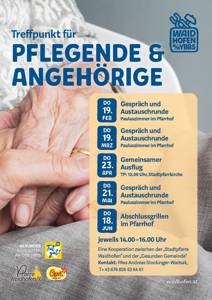 Der Stammtisch für Pflegende und Angehörige findet in Kooperation mit der Stadtpfarre Waidhofen/Ybbs in monatlichen Abständen bereits seit einigen Jahren statt.Der Treffpunkt will darauf aufmerksam machen, dass Pflegende und Angehörige nicht alleine sind und Großartiges leisten . Bei den ungezwungenen Treffen, wo jeder und jede herzlich willkommen ist, soll die Gelegenheit geboten werden sich auszutauschen und sich zwanglos über alles unterhalten zu können.