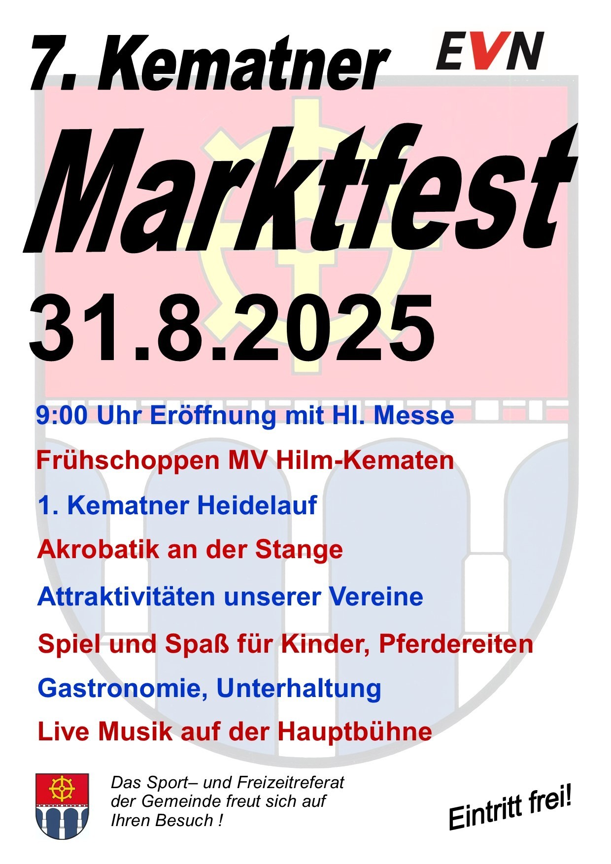 Ein besonderes sportliches Highlight erwartet die Gäste mit dem 1. Kematner Heidelauf, der heuer erstmals im Rahmen des Marktfests stattfindet. Musikliebhaber kommen beim Frühschoppen mit dem Musikverein Hilm-Kematen, einem Konzert von Timeless Rock & Live Musik auf der Hauptbühne auf ihre Rechnung.