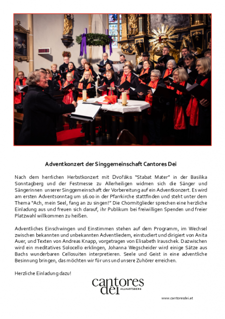 Nach dem herrlichen Herbstkonzert mit Dvořáks “Stabat Mater” in der Basilika Sonntagberg und der Festmesse zu Allerheiligen widmen sich die Sänger und Sängerinnen unserer Singgemeinschaft der Vorbereitung auf ein Adventkonzert. Es wird am ersten Adventsonntag um 16.00 in der Pfarrkirche stattfinden und steht unter dem Thema “Ach, mein Seel, fang an zu singen!” Die Chormitglieder sprechen eine herzliche Einladung aus und freuen sich darauf, ihr Publikum bei freiwilligen Spenden und freier Platzwahl willkommen zu heißen.