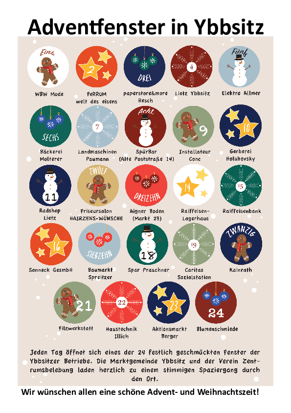 Jeden Tag öffnet sich eines der 24 festlich geschmückten Fenster der Ybbsitzer Betriebe. Die Marktgemeinde Ybbsitz und der Verein Zentrumsbelebung laden herzlich zu einem stimmigen Spaziergang durch den Ort.