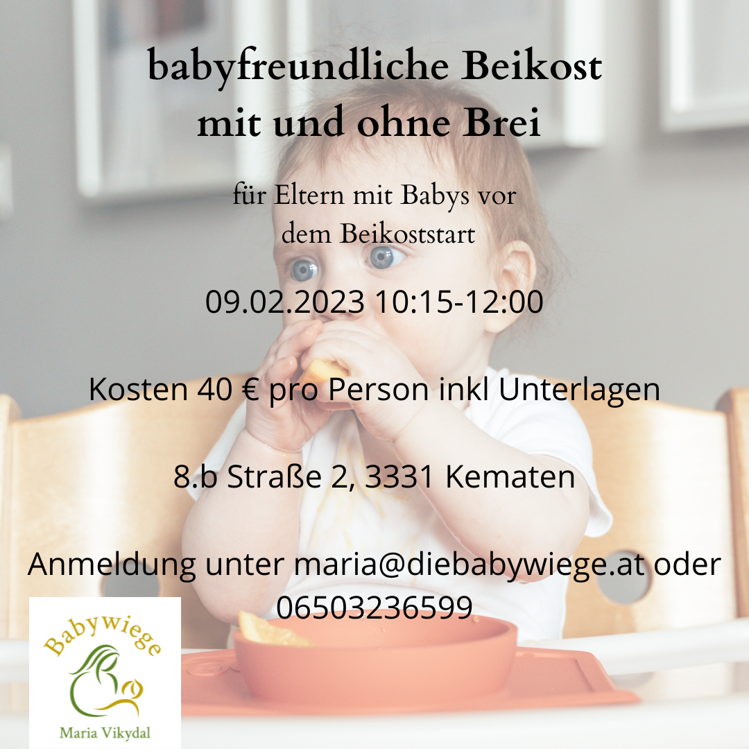 Dieser Workshop richtet sich an Eltern die kurz vor dem Beikostbeginn stehen und sich über die gängigen Empfehlungen und das Vorgehen informieren möchten. Der Workshop beinhaltet unter anderem die Themen: • Aktuelle Beikostempfehlungen • Wann, Was, Wie viel, wie? • Beikostreifezeichen • Brei, Fingerfood & Co • Selbst kochen vs. Fertiggläschen • Sicherheit beim Essen (Verschlucken vs. Ersticken) • Praktische Übungen • Fertiggerichte unter der Lupe Anmeldung und Infos unter 0650/3236599 oder maria@diebabywiege.at
