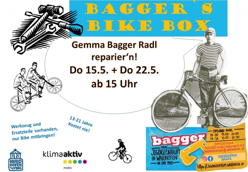 Wir öffnen wieder unsere "Bike Box". Zusammen mit unseren Betreuer*innen hast du die Möglichkeit dein Fahrrad für den Frühling bereit zu machen. Bremsen einstellen, Seilzug tauschen, Patschen picken? Alles kein Problem. Ersatzteile und Werkzeuge liegen für Dich bereit!Für alle von 13-21 Jahren, die Teilnahme ist wie immer im Jugendzentrum Bagger kostenlos.