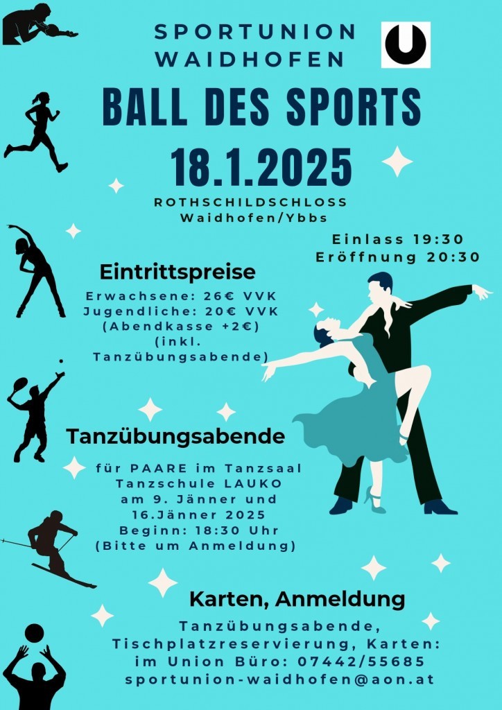 Karten können online unter https://eventfrog.at sowie im Sportunion-Büro erworben werden. Tischplatzreservierungen und Anmeldungen zu den Tanzübungsabenden sind im Sportunion-Büro unter 07442/55685 oder sportunion-waidhofen@aon.at möglich!