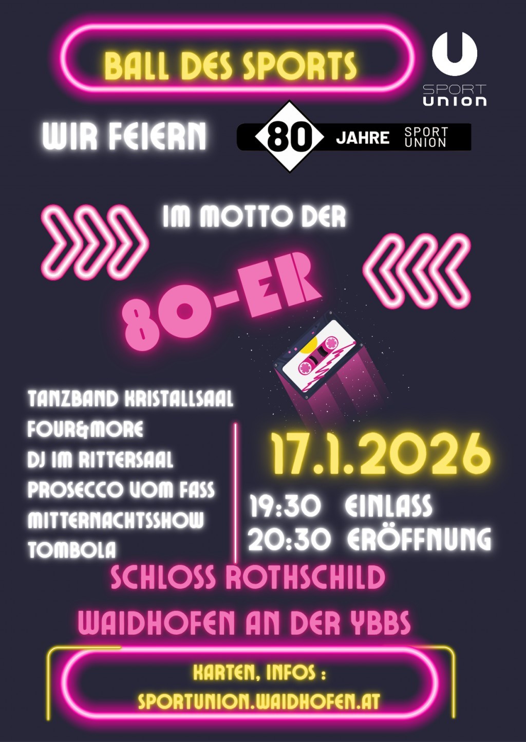 Ball des Sports 2026Am 17. Jänner 2026 feiert die Sportunion Waidhofen/Ybbs ganz im Zeichen der 80er Jahre den alljährlichen Ball des Sports im wunderschönen Rothschildschloss Waidhofen/Ybbs!