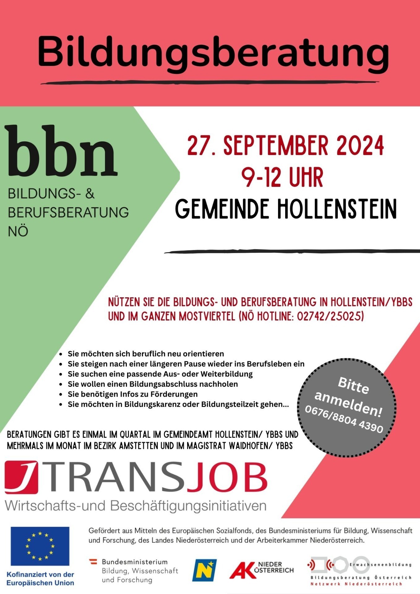 Die Bildungs- und Berufsberatung NÖ bietet kostenlose, vertrauliche und unabhängige Informations- und Beratungsgespräche zu verschiedenen Themen rund um Bildung und Beruf: • Wir unterstützen Sie bei der Suche nach geeigneten Bildungsangeboten. • Wir informieren Sie über finanzielle Förderungen und Beihilfen. • Wir begleiten Sie bei der Berufswahl oder beruflichen Veränderung. Bei Interesse vereinbaren Sie bitte einen Termin bei Bettina Lanzenberger unter 0676 8804 4390 oder bettina.lanzenberger@transjob.at