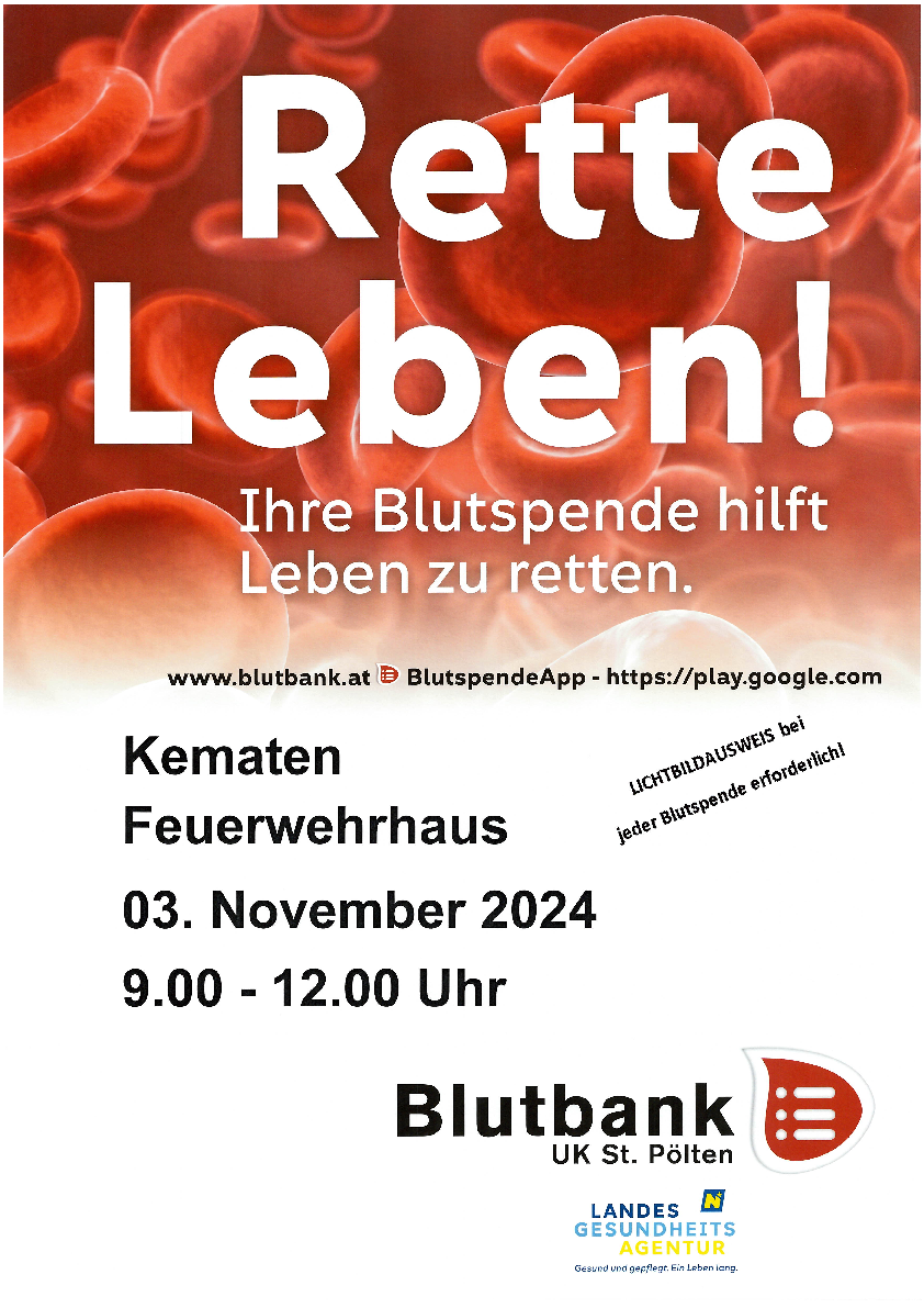 Am 3. November veranstaltet die Blutbank St. Pölten mit der FF Kematen im Feuerwehrhaus Kematen wieder eine Blutspende Aktion. Von 9 bis 12 Uhr besteht die Möglichkeit Blut zu spenden. Bitte nützen Sie die Gelegenheit.