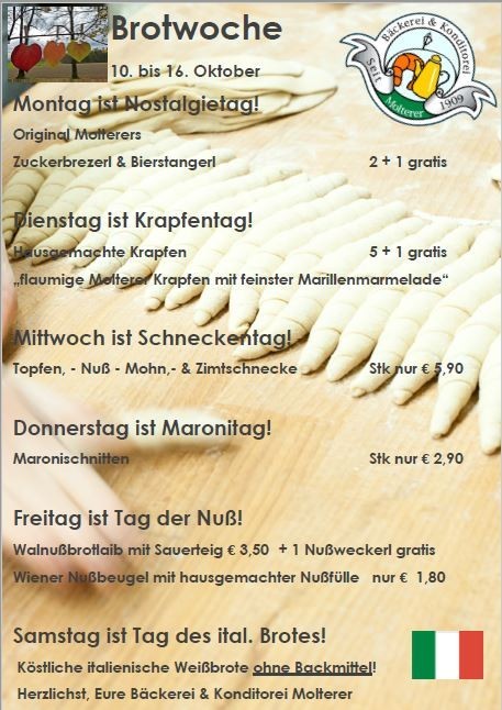 Die Bäckerei Molterer verwöhnt im Rahmen der Ybbsitzer Herbsttage mit abwechslungsreichen Angeboten: Montag - Nostalgietag / Dienstag ist Krapfentag / Mittwoch ist Schneckentag / Donnerstag ist Maronitag / Freitag ist Tag der Nuß / Samstag ist Tag des ital. Brotes!