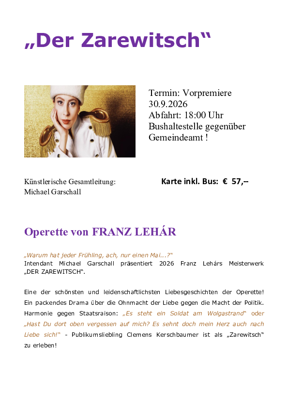 Eine der schönsten und leidenschaftlichsten Liebesgeschichten der Operette! Ein packendes Drama über die Ohnmacht der Liebe gegen die Macht der Politik. Harmonie gegen Staatsraison: „Es steht ein Soldat am Wolgastrand“ oder „Hast Du dort oben vergessen auf mich? Es sehnt doch mein Herz auch nach Liebe sich!“ - Publikumsliebling Clemens Kerschbaumer ist als „Zarewitsch“ zu erleben!