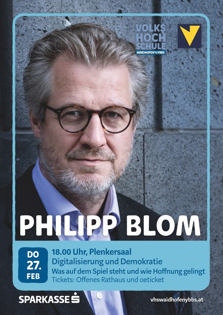 Philipp Blom referiert über die spannendsten Themen unserer Zeit und gibt auch Gelegenheit Fragen zu stellen.Der vielfach ausgezeichnete Autor kommt auf Einladung der Volkshochschule nach Waidhofen an der Ybbs. Er studierte Philosophie, Geschichte und Judaistik in Wien und Oxford. Er lebt als Schriftsteller und Historiker in Wien. Seine Werke verbinden historische Forschung, Philosophie und Belletristik und sind vielfach ausgezeichnet. Er moderiert die Sendung „Punkt Eins“ auf Ö1. Sein letztes Werk trägt den Titel „Hoffnung: Über ein kluges Verhältnis zur Welt“.