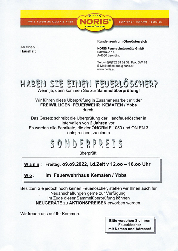 Haben Sie einen Feuerlöscher? Wenn ja, dann nützen Sie die Sammelüberprüf Aktion der FF Kematen.