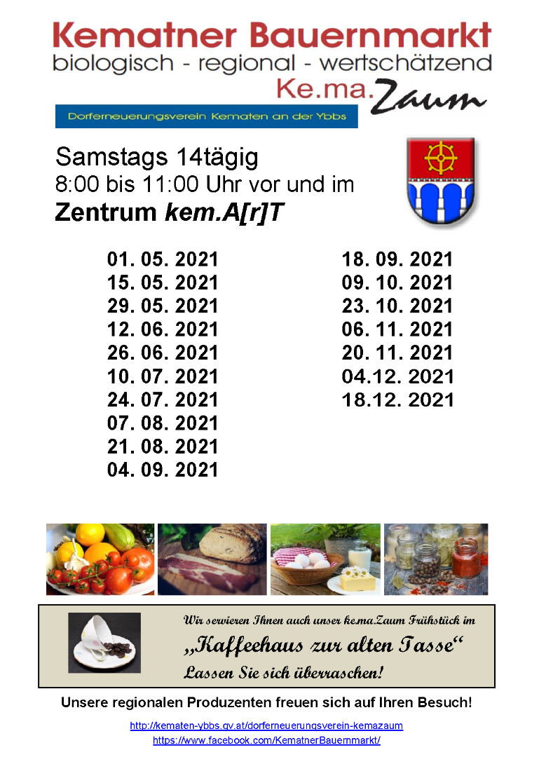 Beim Bauernmarkt des Dorferneuerungsvereines Ke.ma.Zaum gibt es am Vorplatz des Zentrums kem.A[r]T alle 2 Wochen Schmankerl aus der Region und hochwertige biologische Produkte. Das „Café zur alten Tasse“ verwöhnt Sie - wenn Corona bedingt möglich - mit Leckereien und bietet bei einer Tasse gutem Kaffee ganz nach dem Vereinsmotto „Ke.ma.Zaum“ die Möglichkeit zur Kommunikation und zum Austausch untereinander.