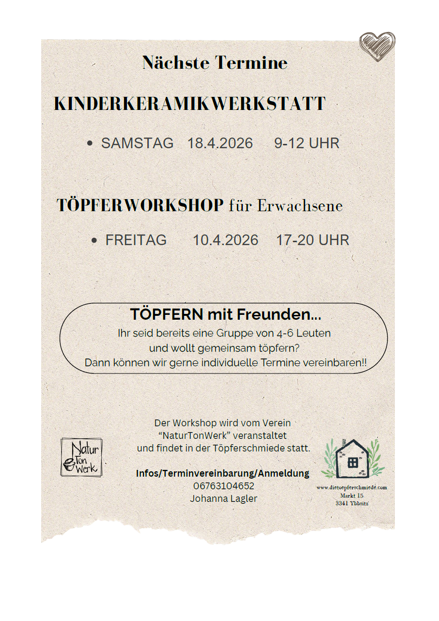 Der Workshop wird vom Verein "NaturTonWerk" veranstaltet und findet in der Töpferschmiede Ybbsitz statt.