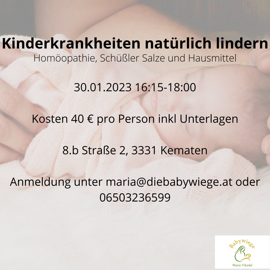 In diesem Workshop erhalten sie Tipps zur Linderung von Husten, Schnupfen, Fieber, Ohrenschmerzen, Bauchschmerzen, wundem Po und Zahnen aus der Naturheilkunde und Homöopathie.