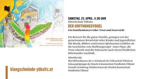Ein Konzert für die ganze Familie, getragen von der gemeinsamen Kreativität vieler Kinder und Jugendlicher. Mit Musik, Bildern, und kurzen Spielszenen erzählen sie die Geschichte vom Hoffnungsvogel - einer Figur, die Trost schenkt und die Sehnsucht nach einem friedlichen Miteinander wachhält.