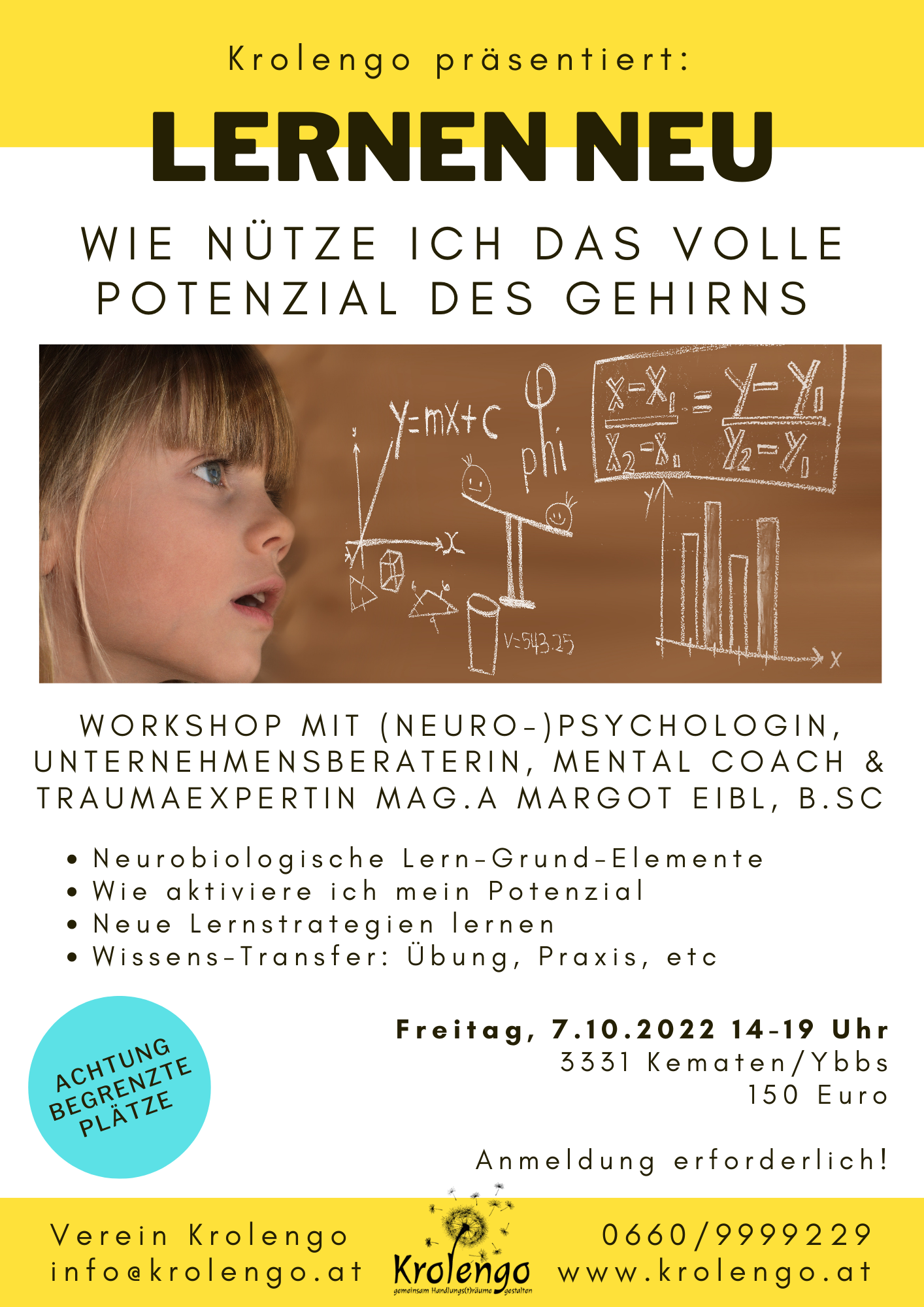 Workshop mit (Neuro)-Psychologin, Unternehmensberaterin, Mental Coach und Trauma-Expertin Mag.a Margo Eibl B.Sc Neurobiologische Lern-Grund-Elemente Wie aktiviere ich mein Potenzial Neue Lernstrategien lernen Wissens-Transfer: Übung, Praxis, etc. Freitag, 7.10.2022 14-19 Uhr 3331 Kematen/Ybbs 150 Euro Anmeldung erforderlich – unter 0660/9999229 oder info@krolengo.at