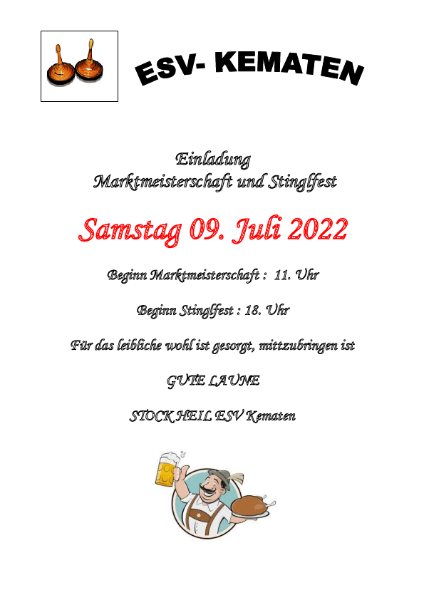Der ESV Kematen lädt zur Marktmeisterschaft und zum anschließenden, traditionellen Stinglfest herzlich ein. Für das leibliche Wohl ist bestens gesorgt!