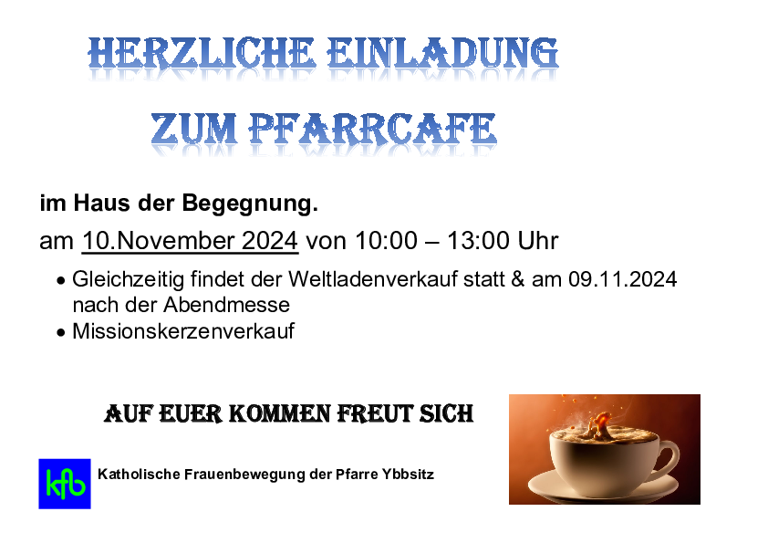 Die Katholische Frauenbewegung der Pfarre Ybbsitz lädt herzlich zum Pfarrcafe in das Haus der Begegnung ein: