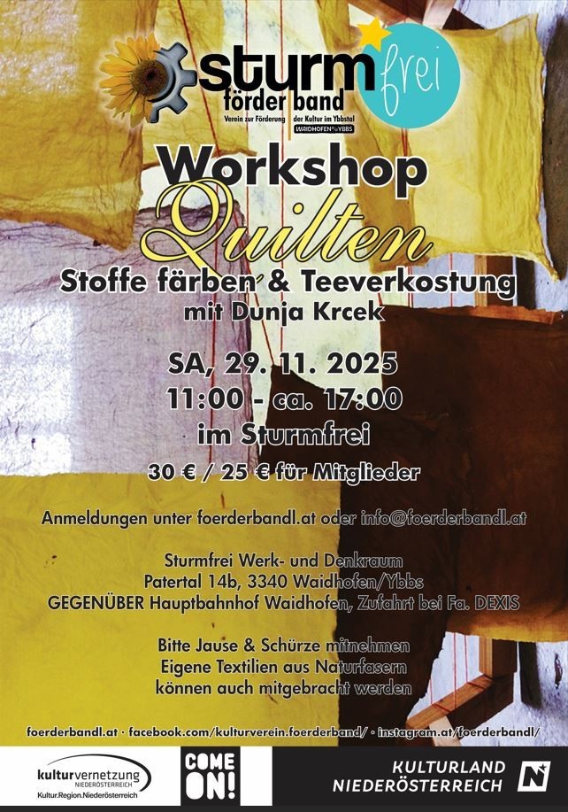 Einer der letzten Workshops im Jahr 2025 des Kulturverein Förderbands: Am Samstag, 29. November bereiten wir uns im Sturmfrei auf die kalte Jahreszeit vor – ab 11:00 wird uns die liebe Dunja Krcek (bildende Künstlerin aus Wien) bis ca. 17:00 begleiten und mit uns Stoffe färben, Quilten und Heil- & Färbetee verkosten.