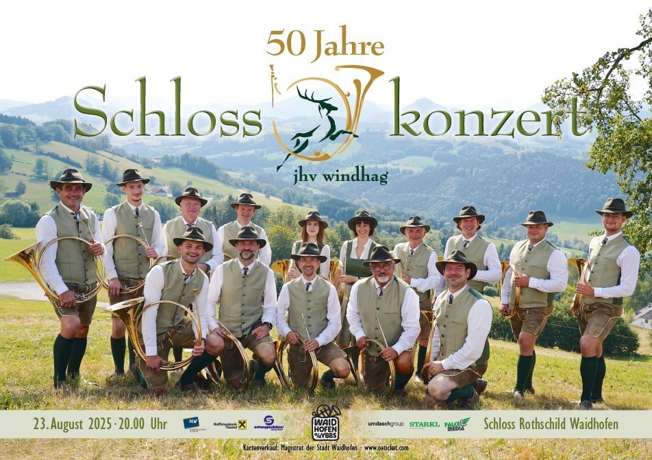 Auch heuer findet wieder das traditionelle Jagdhornkonzert des Jagdhornvereines Windhag im wunderschönen Ambiente von Schloss Rothschild statt. Zum 50jährigen Jubiläum sorgen die Klänge des Jagdhornvereins Windhag, der Windhager Alphornbläser und der 7/8 Sänger für ein stimmungsvolles Konzert.Bei Schlechtwetter findet die Veranstaltung im Plenkersaal statt.