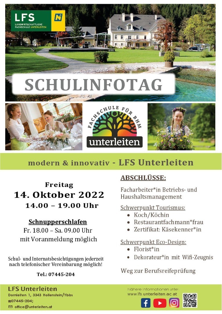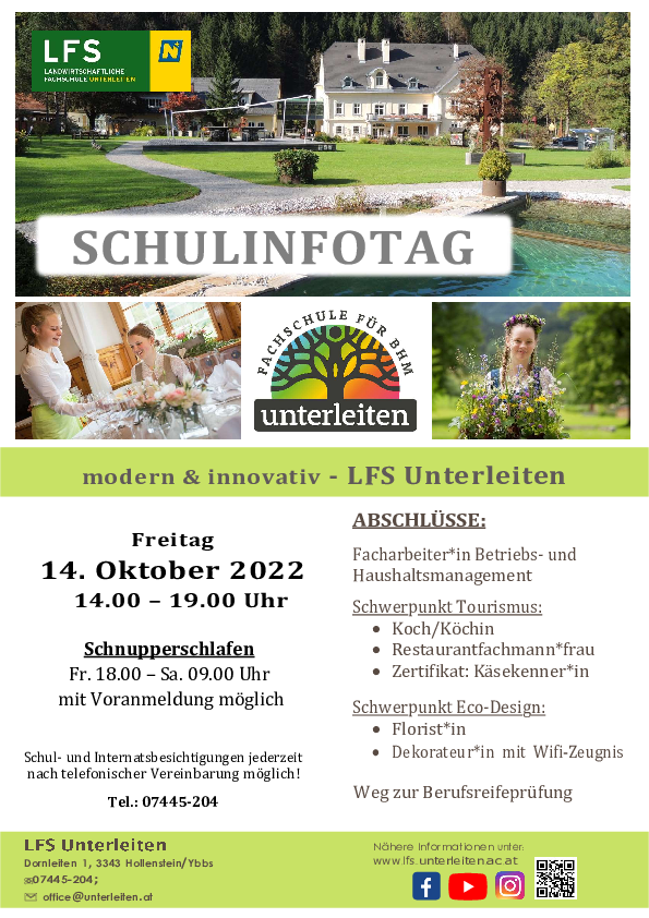 Schulinfotag LFS Unterleiten: Freitag, 14. Oktober 2022 / 14 - 19 Uhr
