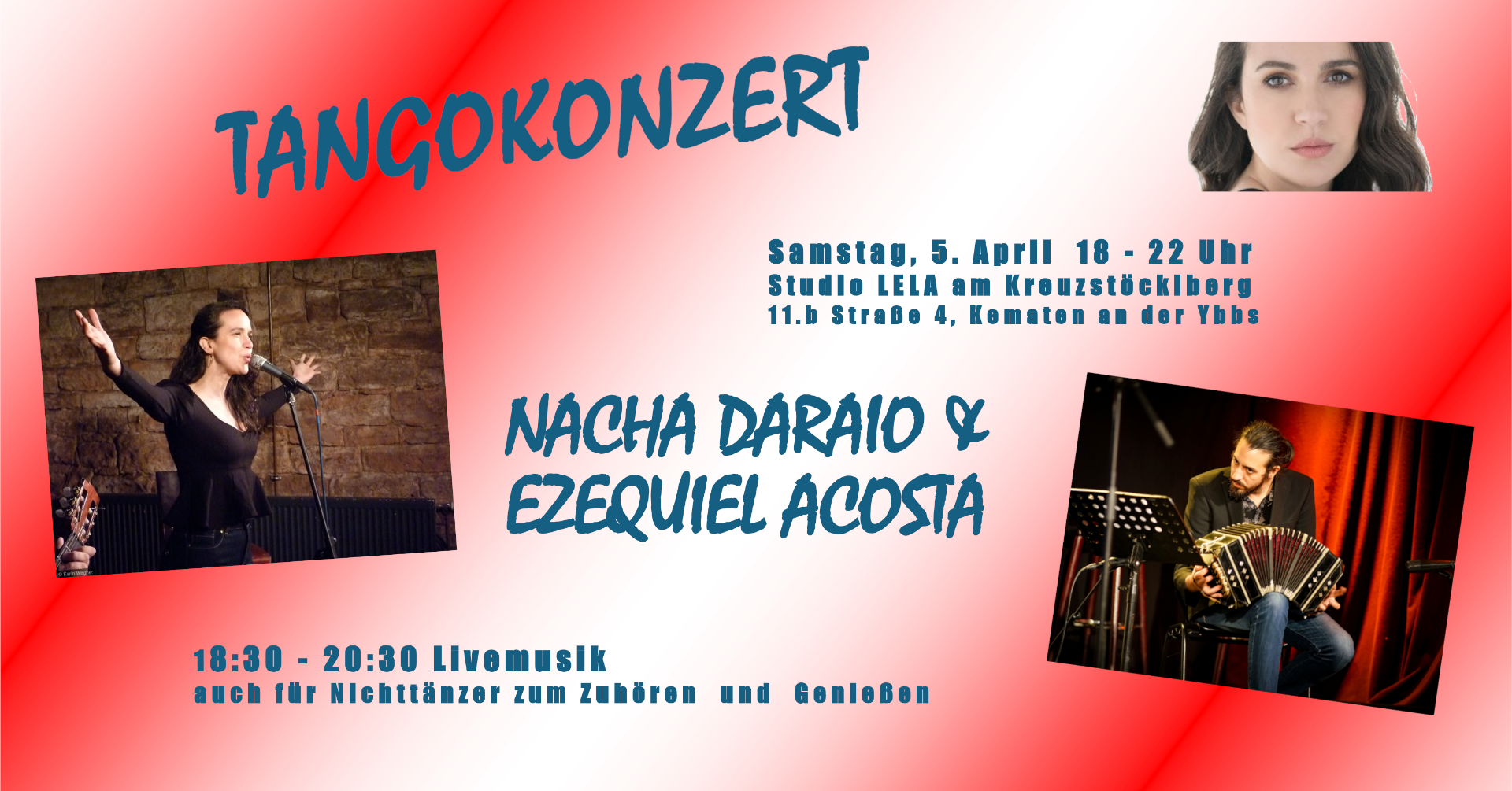 Erlebe einen unvergesslichen Abend voller Tango Argentino! Das "Studio LELA am Kreuzstöcklberg" freut sich, die charismatische Tango-Sängerin Nacha Daraio aus Buenos Aires und den virtuosen Bandoneón-Spieler Ezequiel Acosta aus Mendoza begrüßen zu dürfen. Gemeinsam entführen sie in die leidenschaftliche Welt des Tango Argentino – mit ausdrucksstarkem Gesang, authentischer Interpretation und einzigartigen Arrangements.