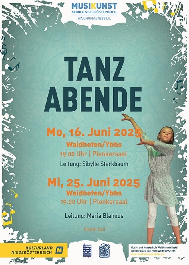 Die Schülerinnen und Schüler der beiden Tanzklassen von Sibylle Starkbaum und Maria Blahous präsentieren im Plenkersaal, was in diesem Schuljahr erarbeitet wurde. Ob klassisches oder modernes Ballett, Video- und Showdance oder kreativem Kindertanz - die jungen Tänzerinnen und Tänzer sorgen für einen dynamischen und abwechslungsreichen Abend und freuen sich auf zahlreiche Zusachauer*innen! Eintritt frei!