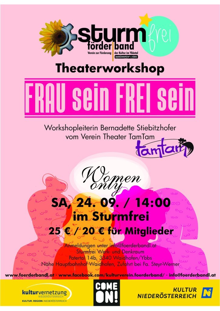 Theaterworkshop – FRAU sein FREI seinEndlich ist es wieder soweit: Am Samstag, 24. 09. beehrt uns Bernadette Stiebitzhofer vom Verein TamTam endlich wieder im Sturmfrei und leitet einen Theaterworkshop zum Thema „Frau sein – Frei sein“.