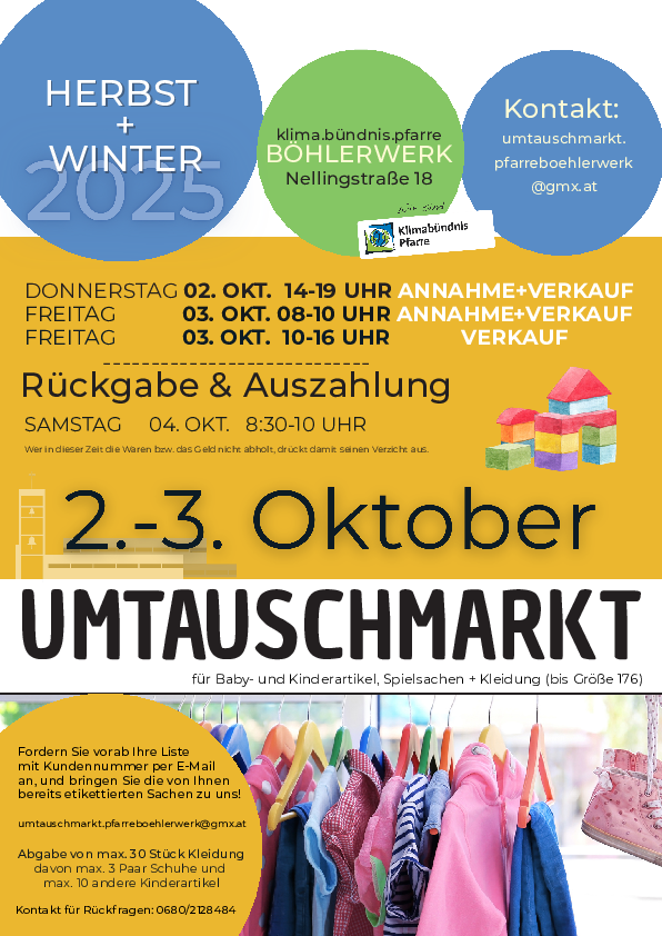 Nikoläuse, Christkind-Helferinnen, Golis, Gödis, Omas, Opas aufgepasst! Von 2.-3. Oktober kann im Pfarrzentrum Böhlerwerk wieder verkauft und eingekauft werden - so ist es möglich, bares Geld zu sparen und gleichzeitig Ressourcen zu schonen. Das Pfarrzentrum Böhlerwerk (Nellingstraße 18) öffnet die Tore für einen Umtauschmarkt für Baby- und Kinderartikel, Spielsachen und Kleidung. Gebrauchte aber gut erhaltene Kinderartikel können zum Umtauschmarkt nach Böhlerwerk gebracht werden – hier hat schon so manches neue Lieblingsstück bis Größe 176 eine*n neue*n Besitzer*in gefunden! Angenommen werden Artikel für die Herbst- und Wintersaison. Es besteht die Möglichkeit zur Abgabe von maximal 30 Stück pro Person, davon höchstens 3 Paar Schuhe und maximal 10 Spielwaren. Kleidung darf bis zur Größe 176 gebracht werden. Warenannahme am Donnerstag 2. Oktober von 14-19 Uhr sowie Freitag 3. Oktober von 8-10 Uhr nur nach Voranmeldung unter umtauschmarkt.pfarreboehlerwerk@gmx.at ! Verkauf: Donnerstag, 2. Oktober von 14-19 Uhr und Freitag, 3. Oktober von 8-16 Uhr Die Rückgabe und Auszahlung findet am Samstag, 4. Oktober von 8.30-10 Uhr statt. Wer in dieser Zeit die Waren bzw. das Geld nicht abholt, drückt damit seinen Verzicht aus. Kontakt für Rückfragen: umtauschmarkt.pfarreboehlerwerk@gmx.at oder 0680/2128484 Viele gute Gründe sprechen dafür, den Umtauschmarkt in Böhlerwerk zu besuchen: - Kinderartikel bekommen eine zweite Chance, Geld und Ressourcen werden gespart: 8 kg CO2 wird bei der Herstellung jedes einzelnen neu gekauften T-Shirts verbraucht. - Viele junge Eltern nutzen die Zeit zwischen dem Einkauf zum Austausch mit Gleichgesinnten. - Der Pfarrsaal bietet in diesen Tagen Inspiration und tolle Geschenke für Geburtstag, Godentag, Adventkalender, Weihnachten und Co