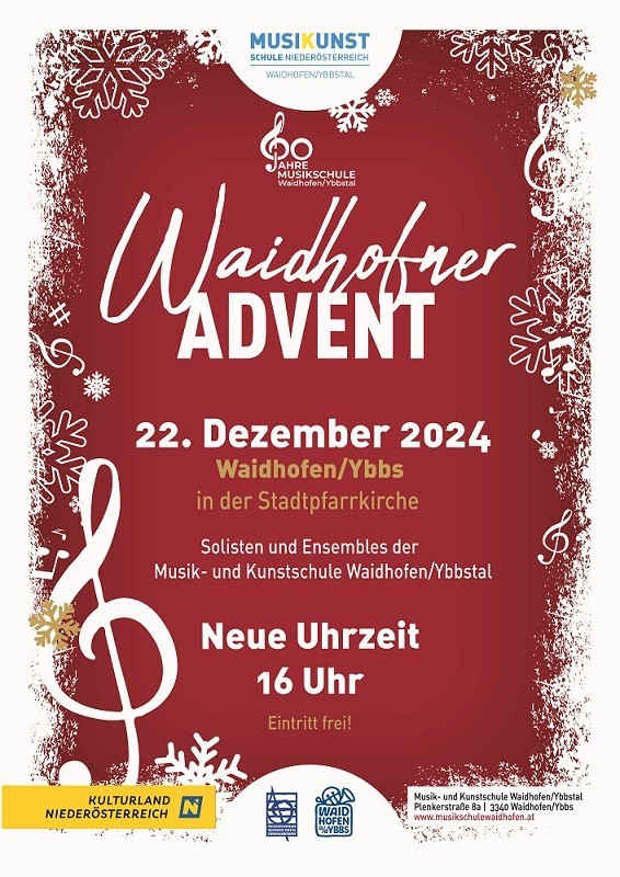 Die Musik- und Kunstschule Waidhofen/ Ybbstal freut sich darauf, zum traditionellen Weihnachtskonzert in der Stadtpfarrkirche einzuladen. Richtig feierlich wird es beim „Waidhofner Advent“, denn die Lehrkräfte und MusikschülerInnen sorgen mit ausgewählten Liedern für ein besonders stimmungsvolles Programm. Gönnen Sie sich eine Pause in der vorweihnachtlichen Zeit und genießen Sie einen besinnlichen „Waidhofner Advent“ am 22. Dezember um 16 Uhr in der Stadtpfarrkirche Waidhofen/Ybbs! Wir freuen uns auf viele Besucher, mit denen wir gemeinsam dieses musikalische Jahr in aller Feierlichkeit beschließen möchten.