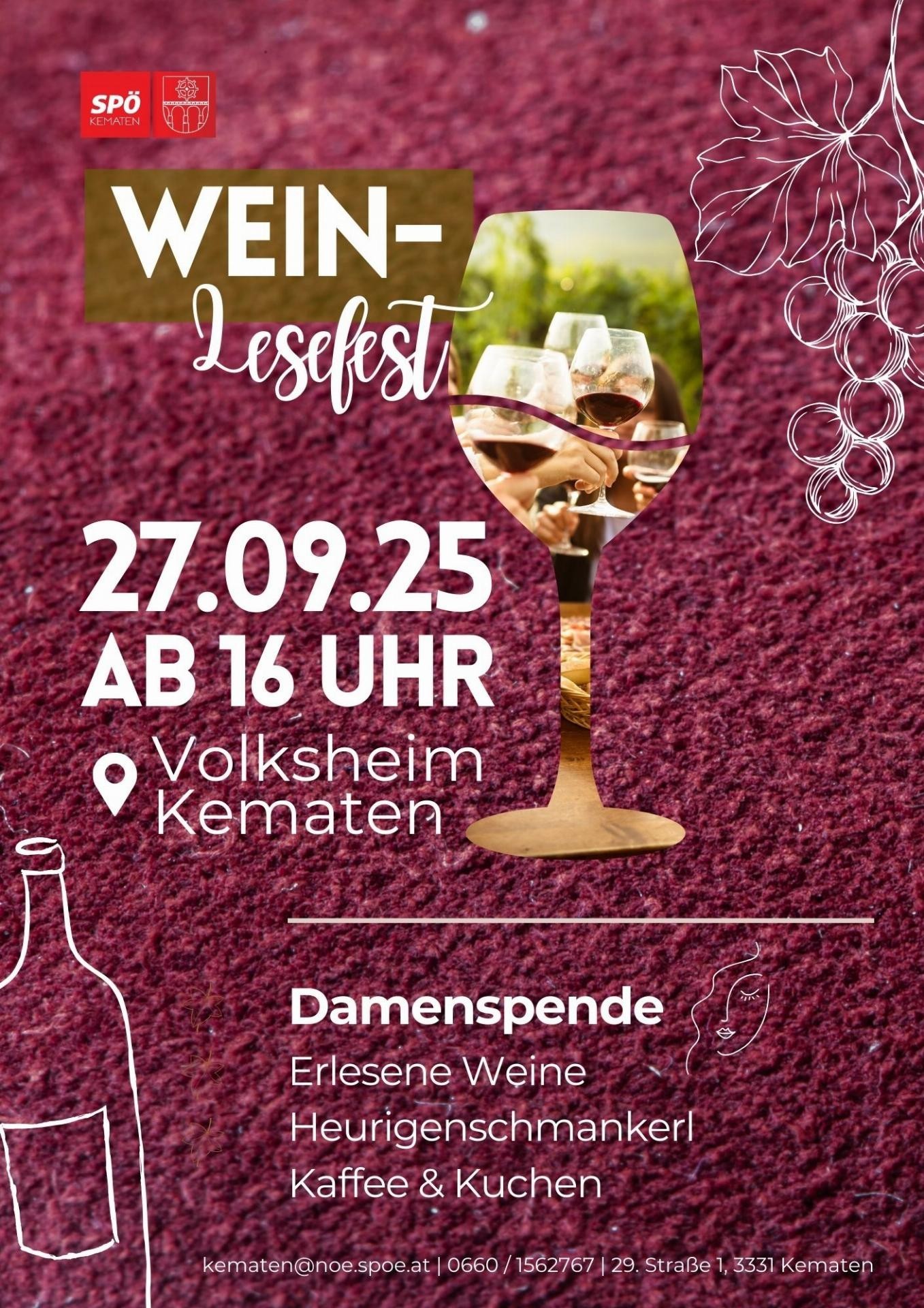 Wir laden euch herzlich zu unserem Weinlesefest 2025 ein! Euch erwarten: Erlesene Weine Heurigenschmankerl Kaffee & Kuchen Damenspende für unsere weiblichen Gäste Und keine Sorge: Auch Nicht-Weintrinker:innen kommen auf ihre Kosten! Wir freuen uns schon jetzt auf nette Gespräche bei dem ein oder anderen Achterl! Euer Team der SPÖ Kematen