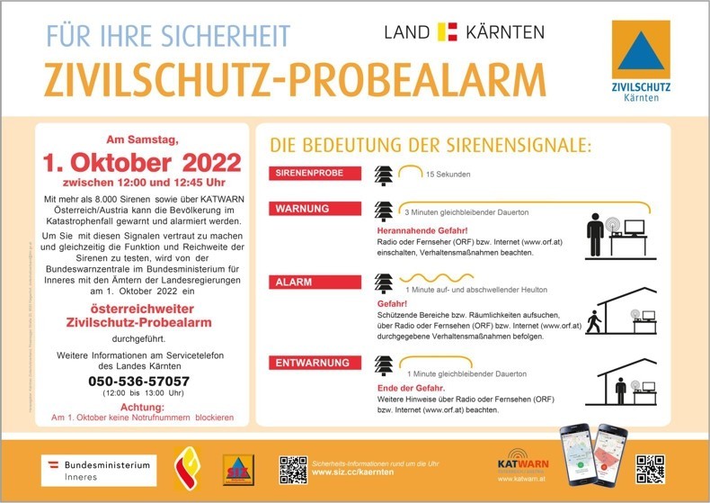Jedes Jahr wird am ersten Samstag im Oktober über Initiative des Bundesministeriums für Inneres in ganz Österreich ein Zivilschutz-Probealarm durchgeführt. Nächster Termin für diesen bundesweiten Sirenentest: Samstag, 1. Oktober 2022.